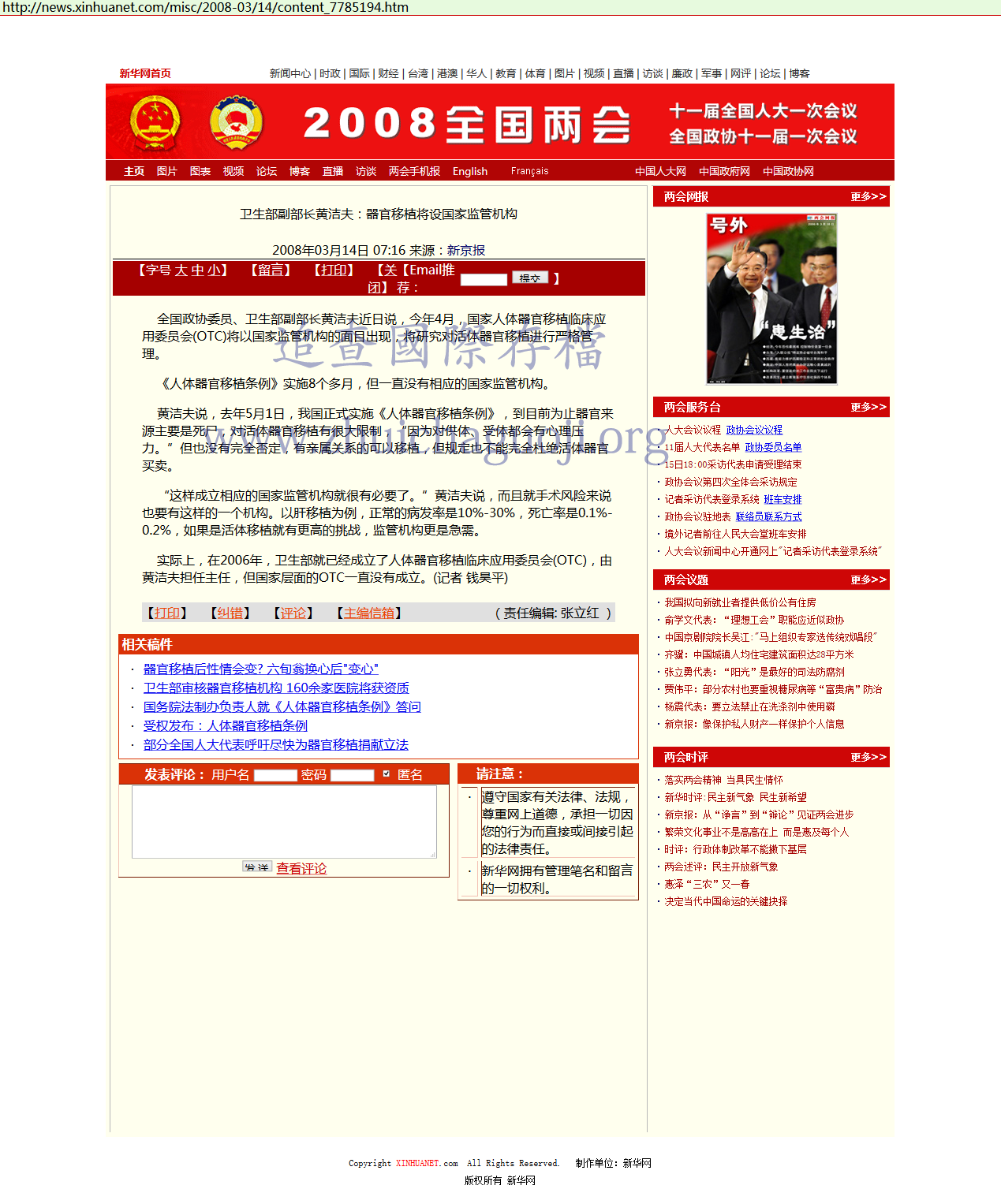 [2]《新华网》2008年3月14日“卫生部副部长黄洁夫:器官移植将设国家监管机构”来源:新京报
