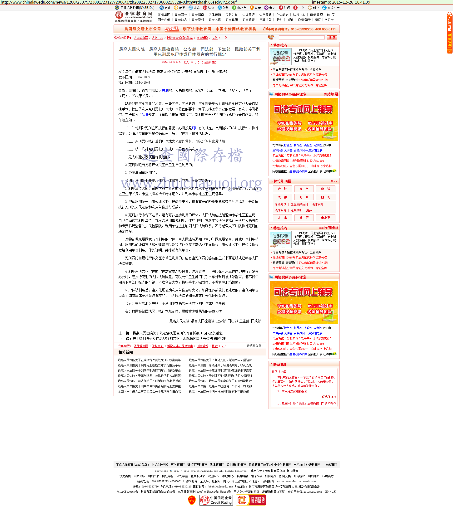 [1]《法律法规》最高人民法院、最高人民检察院、公安部、司法部、卫生部、民政部关于利用死刑罪犯尸体或尸体器官的暂行规定