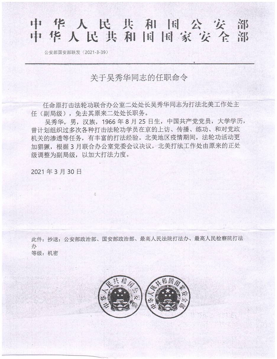 追.查!国际获得一份中共公安部和国安部联合发布的关于“打法北美工作处”主任吴秀华的任命书(见附件)。此任命书透露了以下信息: