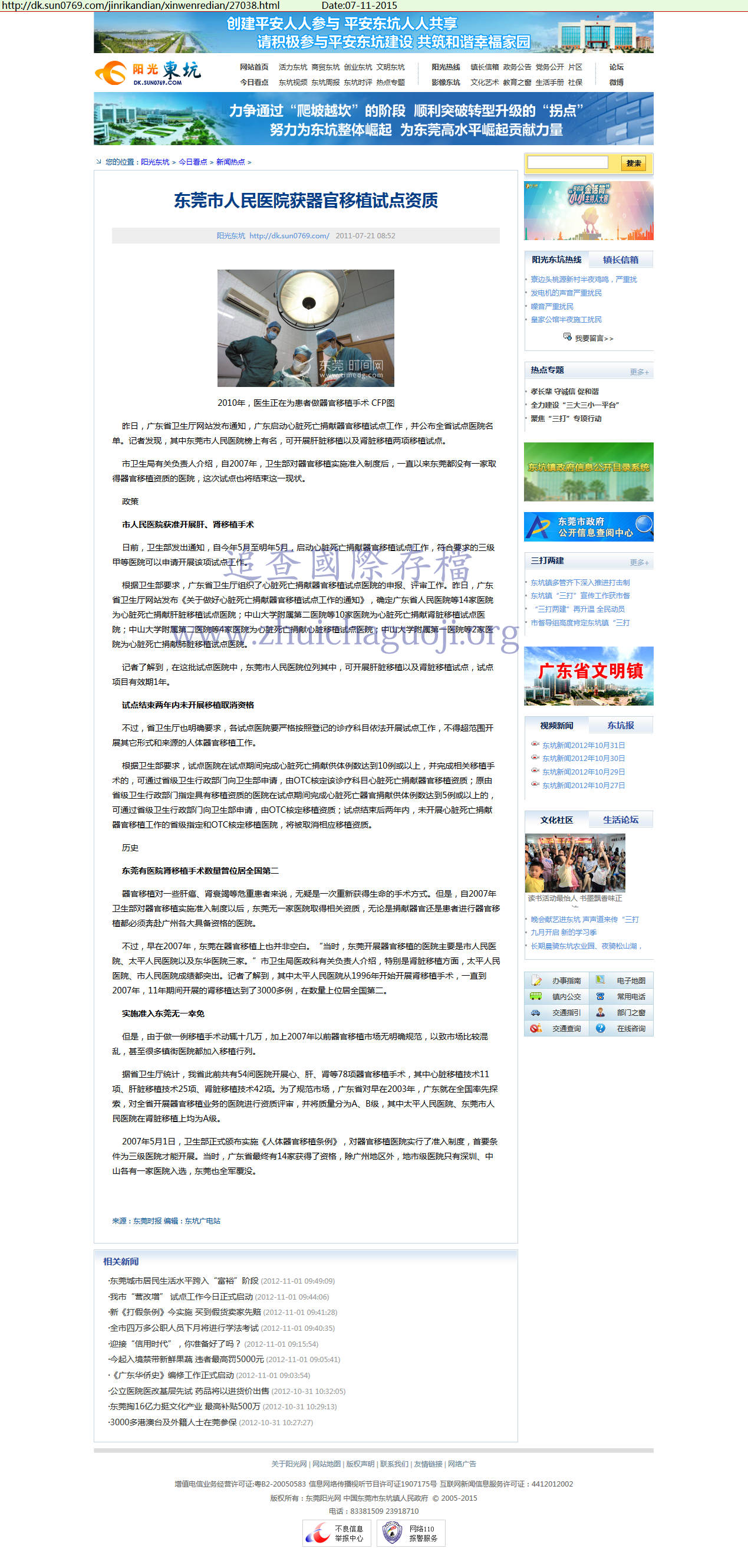 [23]《阳光东坑》东莞市人民医院获器官移植试点资质2011-07-21